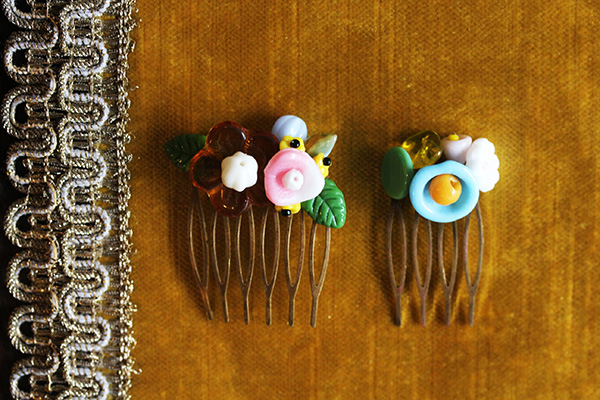 レッスン料:1080円 + 材料費実費(写真のサンプルはコーム、ビーズ、ボタンを使用。全部で2225円になります。コームは2ケセットです)