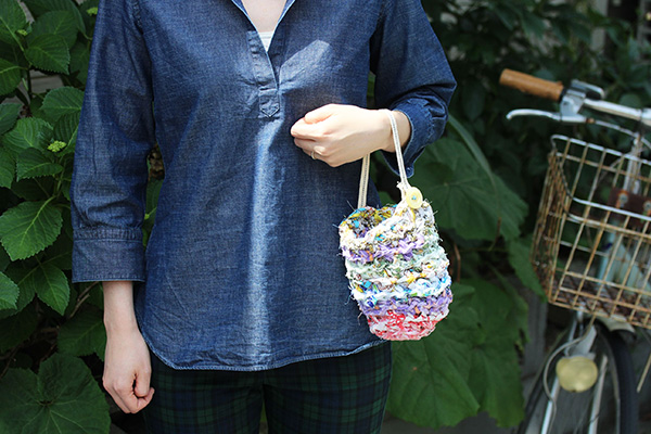 それを使って、太いかぎ針でざっくざっくと編んだのがこのミニバッグ。