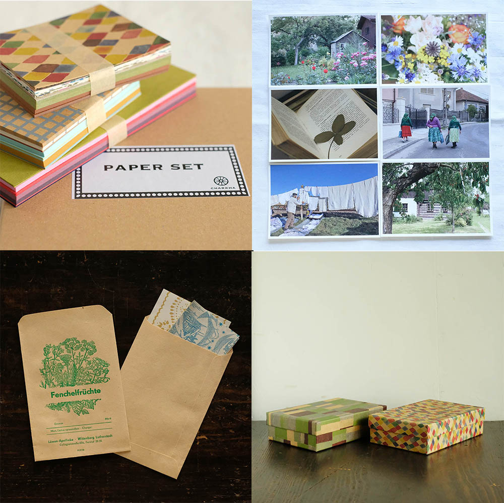 東欧の古い紙袋や切手、マッチラベル、コースターなどの紙ものに加えて、チャルカオリジナルの包装紙封筒、グラシンファイル、レターセット、ポストカードなどたくさんご用意しております。