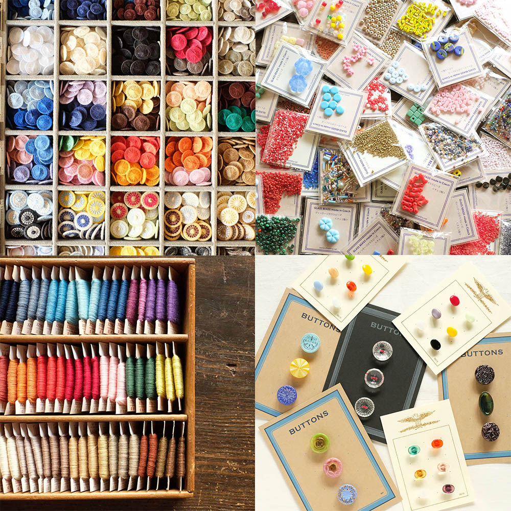 布博では、糸ボタンやチェコの糸をはじめ、ビーズ、とんぼ玉、ヴィンテージはぎれ、ドイリーなどたくさん揃えてお待ちしています。