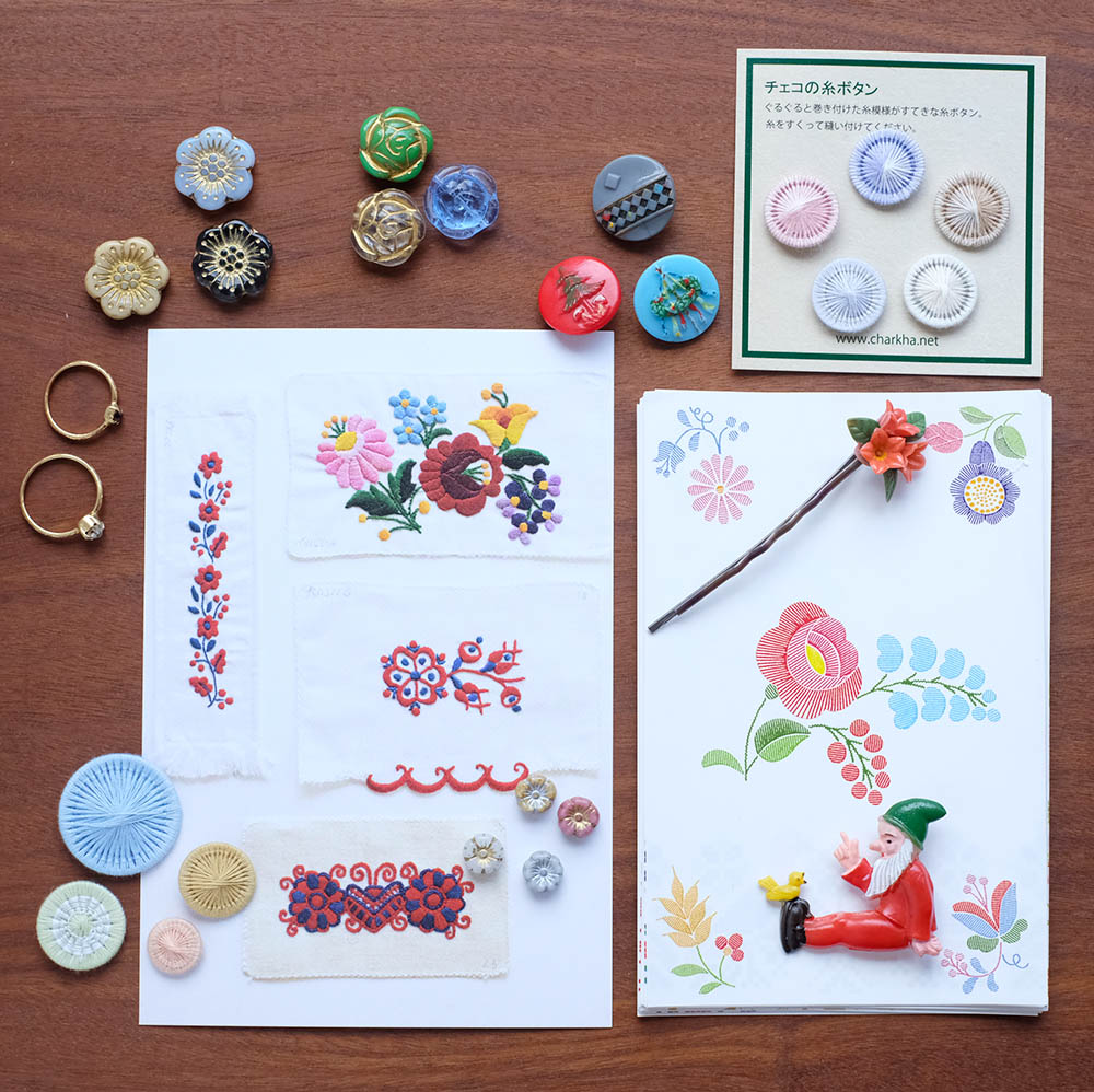 東欧の古い紙ものに加えて、チャルカオリジナルのメッセージカードやポストカードなどの紙もの、チェコの糸ボタン、ガラスボタン、ビーズ、ブローチや子ども指輪などたくさんご用意しております。