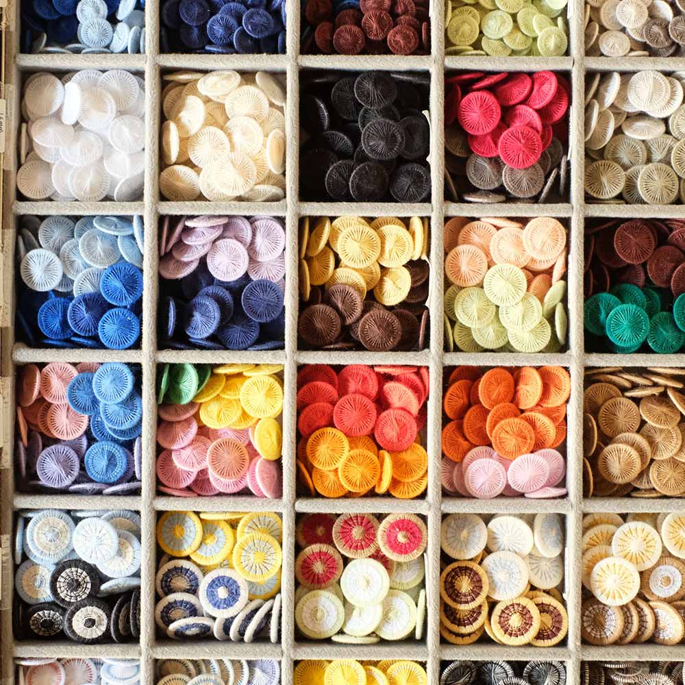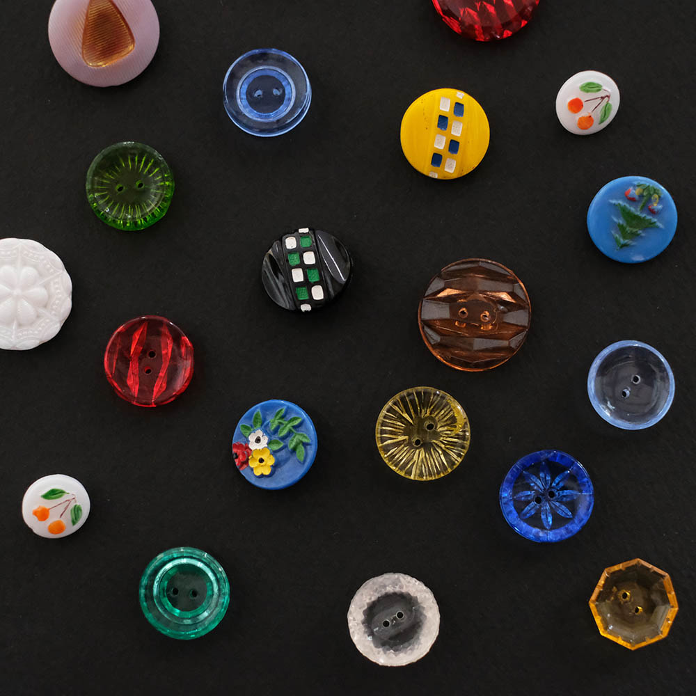 チェコの糸ボタン、糸、ガラスビーズ、ヴィンテージのガラスボタン、東欧のカットクロス、レース、刺しゅうのモチーフなどの手芸素材をたくさん揃えています。